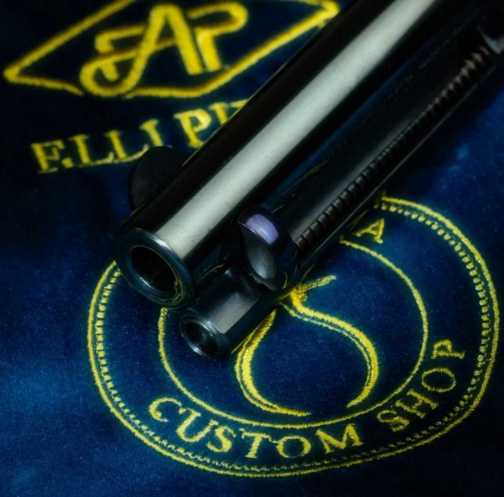 Parkwest Arms was recruited to contribute the color case-hardening process on the frame and hammer using the traditional bone and charcoal method. A deep gloss blued finish for the rest of the gun was considered a requirement among all parties. The hand set nitride-blued ejector pin, cylinder release pin, and screws serve as a testament to the meticulous attention to detail and refinement. The Migliore’s one-piece grip is carved from high-grade walnut and the completed look, we believe, speaks for itself.